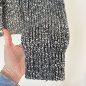 Chic charcoal cardigan with gold button-up front. Warm& Soft knit texture. Ideal for layering.