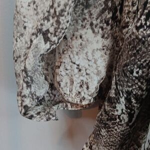 This is a nice top in size XXL and measures 24 inches from pit to pit. It has a square neck and has elastic at the shoulders. It is long sleeve and has elastic at the wrist. The sleeves are sheer and the body of the top is not. The fabric is a snake print in browns and black. It is 100% polyester and does not stretch.