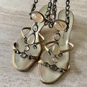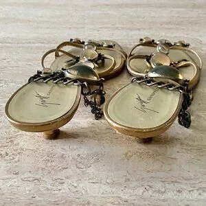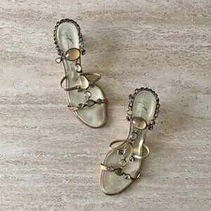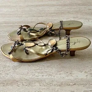 Vintage Giuseppe Zanotti Design gold/bronze leather stone strap sandal kitten heels. Size 39.