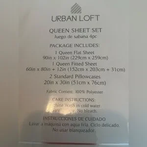 Urban Loft queen sheet set in a vibrant green. Includes flat sheet, fitted sheet, and two pillowcases. Silky soft and fade resistant. Package includes 1 Queen Flat Sheet, 1 Queen Fitted Sheet, 2 Standard Pillowcases. Fabric Content: 100% Polyester. Care Instruction on Package. Tags were removed from package.
