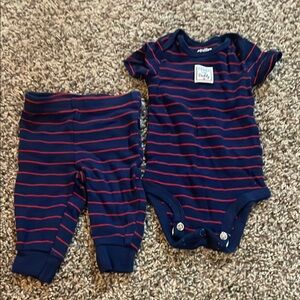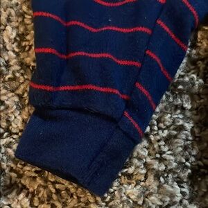 Navy and red striped onesie and pants set. Comfortable and stylish. Perfect for everyday wear.