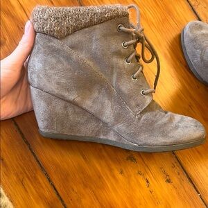 Step out in style with these chic suede wedge ankle boots. Perfect for any occasion, these tan boots offer both comfort and elegance. Some small scuffs on the ankle.