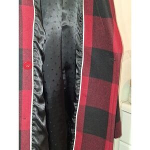 The coat has been dry cleaned Banana Republic double-breasted trench coat in a bold red and black buffalo plaid. Crafted from premium Italian fabric, this structured outerwear piece features a classic notched lapel, a coordinating tie-waist belt for a defined silhouette, and functional side welt pockets. The interior is fully lined with a signature monogram jacquard fabric, providing a polished finish to this timeless winter staple.