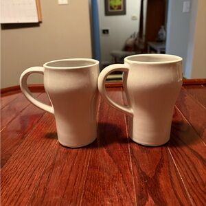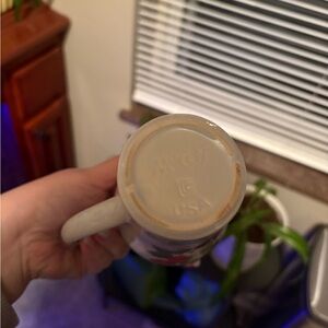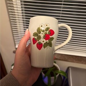Vintage McCoy Pottery Strawberry Country Mugs. About 5 inches tall. In nearly perfect condition. One mug seems to have a small gap in the glaze, pictured, this does not appear to be a chip.