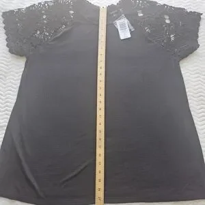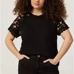 Elegant black blouse with intricate lace sleeves. Perfect for any occasion.