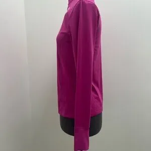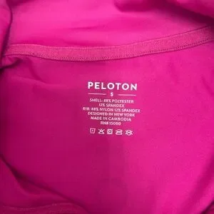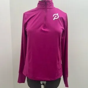 Magenta quarter-zip sweatshirt with Peloton logo. Ideal for workouts or casual outings. Soft and comfortable fabric.