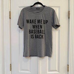 Fun gray graphic tee that reads: “Wake Me Up When Baseball Is Back”