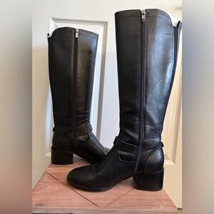 Sleek black heeled boots with buckle detail. Perfect for versatile styling.