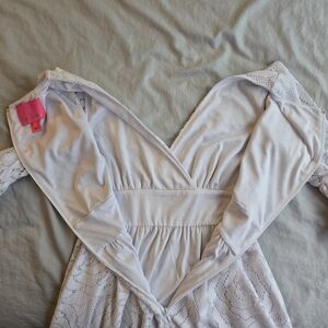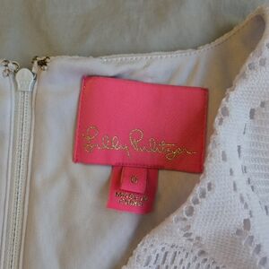 Crisp white lace dress from Lilly Pulitzer - in excellent condition aside from one snag in the lace at the hem, and one small spot on the inner lining that I found (shown in photo, not visible when worn and could likely be bleached if you felt so inclined!).