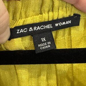 Zac & Rachel Woman semi-sheer- off‑the‑shoulder peasant blouse in size 1X, in a golden chartreuse / mustard yellow color with crochet lace trim along the sleeves and hem. Features an elastic neckline that can be worn on or off the shoulders, 3/4 balloon sleeves with elastic cuffs, and a flowy, boho silhouette that pairs well with jeans, shorts, or skirts; excellent used condition. Approximate measurements: 23.75 in. pit to pit; 24 in. length. Please ask all questions prior to purchase.