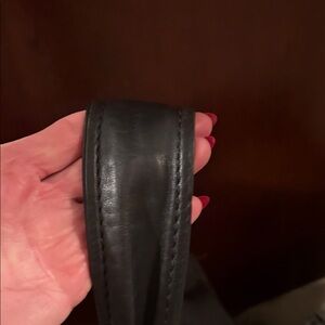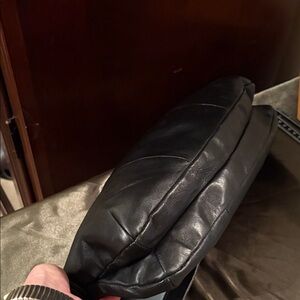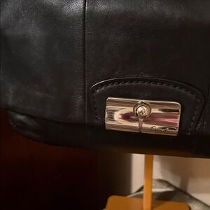 Stylish Coach black leather bag with silver chain details. Features a sleek design and signature Coach tag.
