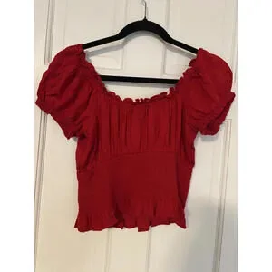 NEW Hollister Red Smocked Waist Short Sleeve Peasant Top L