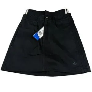 Adidas firebird black denim mini skirt with elastic ribbed waistband featuring signature white side stripes. Made in Indonesia with classic button and zip closure, this skirt includes front pockets and a small trefoil logo detail. New with tags attached, size US 2 (UK 6).