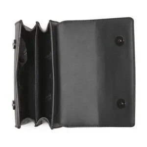 top carry handle, detachable adjustable crossbody strap, includes detachable charm, dual compartment design, stud detail