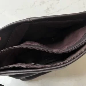 This Etienne Aigner crossbody handbag is a timeless classic. It is in great pre-owned condition. Exterior and interior are clean. The soft brown leather, accented with gold hardware, gives it an elegant look that pairs well with any outfit. The rectangular shape, measuring 8 inches in height and 2 inches in width, makes it a perfect size for everyday use.With a zip closure and adjustable strap, this bag is both secure and comfortable to wear. The interior is lined with cotton and features 2 interior compartments with 2 slip pockets & 1 wall zip pocket to keep your belongings organized. Lightweight and packable, this bag is perfect for travel or casual use.