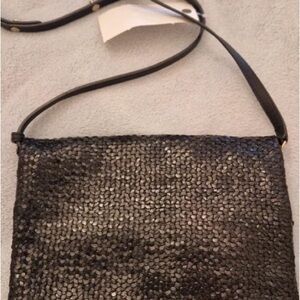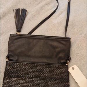 This elegant black woven handbag is perfect for any occasion. Its sleek design and versatile color make it a must-have accessory.