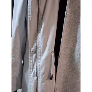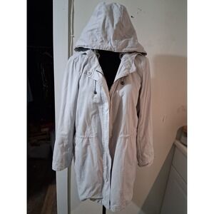 J. Jill hooded parka offers versatile weather protection with a neutral light gray shell and a cozy, detachable fleece lining. Designed with a functional drawstring waist for a customizable silhouette, this mid-length jacket includes a full zip and button front closure, a protective hood, and spacious front pockets. The biconstituent fiber shell provides a durable, smooth finish that pairs effortlessly with casual or outdoor attire.