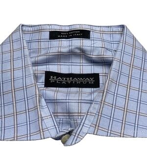 Elevate your dress up attire with this Hathaway Platinum dress shirt. Made of 100% cotton, it offers superior comfort and breathability. The blue plaid design adds a touch of sophistication, perfect for any occasion. This regular fit dress shirt is available in neck size 17-17 1/2 and sleeve length 35-36. Made in Italy, its long sleeves and classic collar make it a versatile addition to any man's wardrobe. Ideal for dressy events or everyday use, this Hathaway Platinum dress shirt is a must-have. Shirt is in excellent, pre-loved condition!