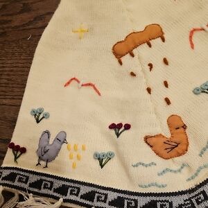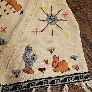 This Kids Traditional Peruvian Poncho is a handmade sweater with fringe accents, perfect for casual occasions during the winter and spring seasons. Made of acrylic knit fabric in multicolor, this unisex kids' poncho features animal appliqué designs that add a playful touch to the overall look. The 12-month size ensures a comfortable fit for little ones, while the Peruvian craftsmanship adds a unique and traditional flair to this stylish cape.