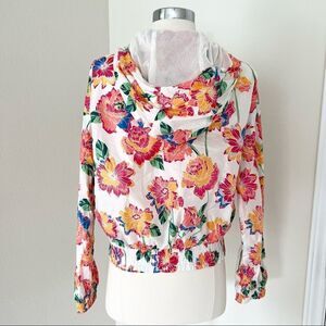 Ivory with a flower print in peach, yellow, green and pink. Two stripes on the front. Full zip front, elastic wrists and waist. Hooded. Mesh lining. Excellent condition.