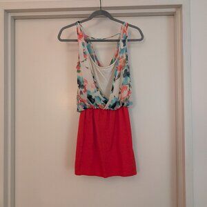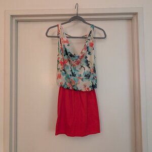 Cowl neck floral mini dress size small. White, blue, and pink floral chiffon top and bright pink body con bottom. Open back/backless. This is such a fun party dress and super flattering. Brand is H&M, but I got it in Paris in ~2014, so it's that especially good European H&M quality from that time. Just selling because I don't have much opportunity to wear it anymore.
