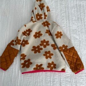 Soft sherpa jacket with vibrant pink trim. Features brown accents for added style.