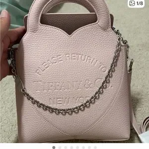 Chic Tiffany & Co. tote in blush pink. Features elegant silver chain detail. Perfect for adding luxury to any outfit.