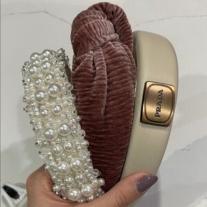 Chic headbands featuring cream and pink velvet designs. Adorned with elegant pearls for a luxurious touch.