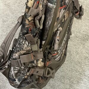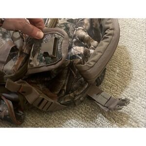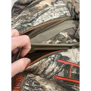 The Redhead Primal Bow/Rifle Heavy Duty H20 Backpack is a large, camo-colored hydration backpack made of durable polyester material with a nylon trim. It features a zip closure, padded straps, and multiple compartments for organization. Specifically designed for hunting, this unisex backpack includes a hidden compartment, hip belt, and inside mesh pockets for added convenience. The RedHead brand ensures quality, making this backpack a reliable choice for outdoor activities in the winter season. Measures 22x12x7. Did not come with bladder when purchased.