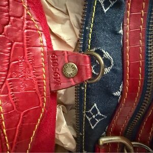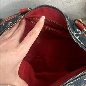Elegant satchel with iconic monogram pattern. Features red accents and gold hardware. Ideal for a chic look.