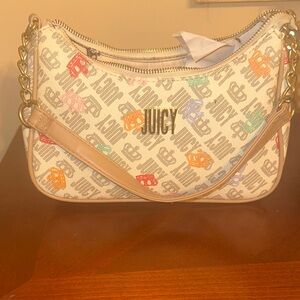 Chic Juicy Couture shoulder bag with vibrant logo pattern. Features gold chain accents and beige trim. Ideal for a stylish look.