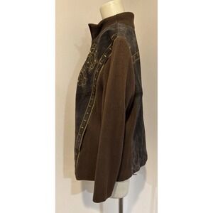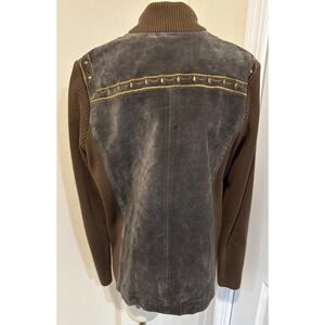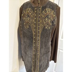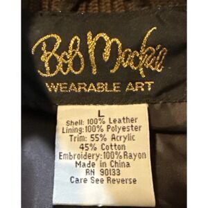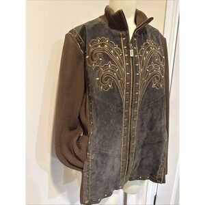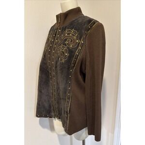 Bob Mackie Jacket Wearable Art Lrg Brown Leather/Knit Western Embroidered Zip