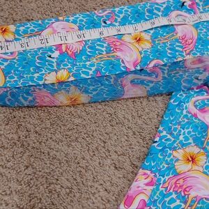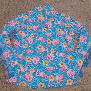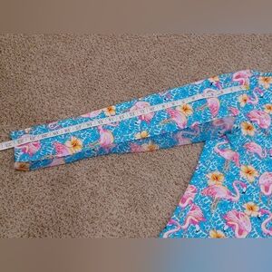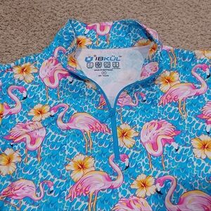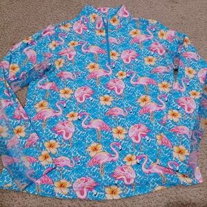 Vibrant blue quarter-zip top with pink flamingo and yellow flower print. Perfect for a fun, casual look.