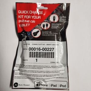 Southeast Toyota Accessories Quick Charge Kit specifically designed for Apple iPhone, iPad, and iPod. New. Includes: dual SMART USB charger, 3 ft & 6 ft lightning charging cable, 3 ft micro USB cable. Ultra high speed charge. Part # 00016-00427 CONNECTIVITY KIT - SMART USB GEN5.