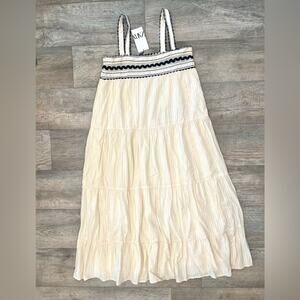 Beautiful ecru midi dress in textured seersucker fabric featuring wide straps, straight neckline, and contrast black lace appliqué detailing across the bust. Flowy A-line silhouette with tiered hem for effortless movement. Fully lined. Sold-out Zara style — perfect for summer vacations, brunch, coastal getaways, and resort wear.
