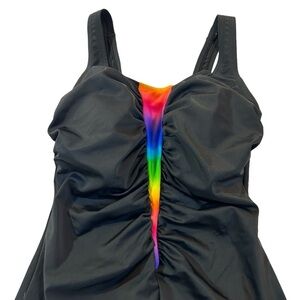 Scoop neck. Ruching down front along the rainbow detail. Built in bra. Scoop back. 82% nylon/18% spandex.