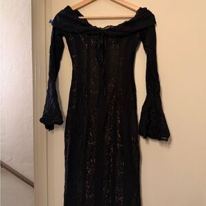 WORN ONCE. House of CB black lace dress with long sleeves. Perfect for elegant events. Features intricate lace design. Train in back