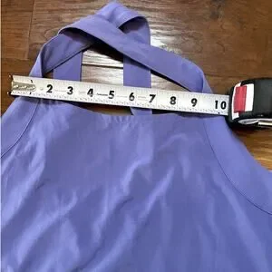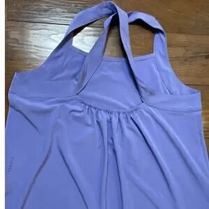 Athleta Arrival Dress in a beautiful purple shade. This maxi-length athletic dress features wide straps with a flattering cross-back design, soft stretch performance fabric, and side slits for easy movement.