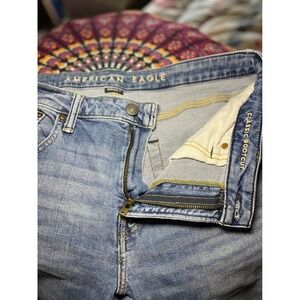 American Eagle Classic Bootcut jeans in a medium wash blue denim with a custom raw hem. These versatile jeans feature a standard five-pocket design, zip fly with button closure, and the signature eagle embroidery on the back pockets. The fabric blend includes recycled cotton and polyester with a hint of stretch for comfort. Please note the hems have been cut to a shorter length with a frayed finish.