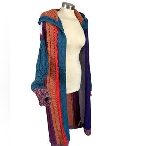Stay cozy and stylish with this vibrant hooded cable knit sweater. Featuring a mix of blue, orange, purple, and white, this sweater adds a pop of color to any outfit. Perfect for layering and keeping warm.