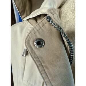 The London Fog Jacket for women in petite XS size is a limited edition piece with a solid beige color and long sleeves. Made from a blend of polyester and cotton, this jacket features a full zip and button closures, perfect for various occasions like travel, casual outings, and workwear. The hooded design adds a stylish touch to this classic London-themed piece, making it a versatile choice for the winter, fall, and spring seasons. With a regular fit and lightweight feel, this designer jacket by London Fog is a must-have for any fashion-forward woman.
