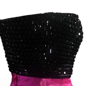 Elegant Sherri Hill strapless gown in vibrant pink and black. Perfect for special occasions.