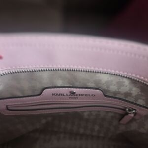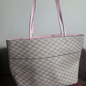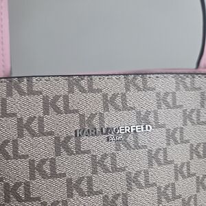 Elevate your style with the Karl Lagerfeld Women's Tote Bag. Featuring a chic gray and pink design, this bag is perfect for any occasion. Carry your essentials in style with this elegant accessory. Barely used, practically new!