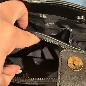 She comes with 2 interior slot pockets, one side zip and an attached zip compartment in the middle. She ALSO comes with a detachable wristlet and matching chain!!!