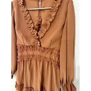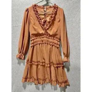 This Burnt Orange Ruffle Short Dress in size Small is a stylish and versatile option for various occasions. With a V-neckline, puff sleeves, and ruffle accents, this dress exudes a feminine and trendy vibe. Made from polyester fabric with a rayon texture, it is perfect for both casual and formal events during the summer and spring seasons. The dress features a button closure and falls under the Fit & Flare and A-Line styles, making it a flattering choice for any woman looking to make a statement with their outfit.