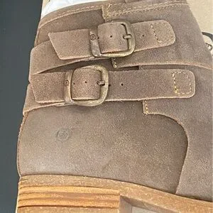 Stylish taupe Born Moraga leather booties with dual buckle straps. Comfortable and versatile for everyday wear.