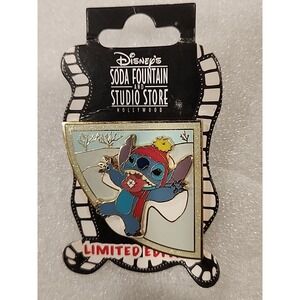 * This Limited Edition pin collection features Stitch through the four seasons. On the Winter pin, Stitch makes a snow angel while catching a snowflake on his tongue. There are four (4) pins in this collection, which join together to create a large circle. This lower-left quadrant features a pin-on-pin 3D Stitch wearing a red cap and scarf/muffler. The white border is glittery. This pin was released at Disney's Soda Fountain and Studio Store located in Hollywood, California on December 6, 2008.