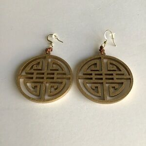 This particular style is an open work, Asian medallion theme with a matte finish gold-color paint on both sides, tied at the top with a brown piece of waxed cord. Very elegant and perfect to wear with a variety of styles. These look fabulous with summer Lilly-style pieces and sundresses!