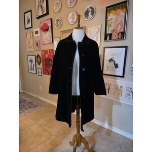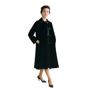 Keywords: vintage coat, black velvet coat, longline coat, classic overcoat, women's coat, velvet overcoat, button front coat, retro coat, vintage outerwear, black coat, elegant coat, chic coat, dress coat, evening coat, designer inspired