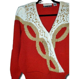 Add a touch of vintage elegance to your wardrobe with this Dana Scott sweater. Featuring a bold red base with intricate gold and white detailing, this V-neck sweater is adorned with delicate beading for a sophisticated look. Perfect for holiday parties or vintage-inspired outfits.